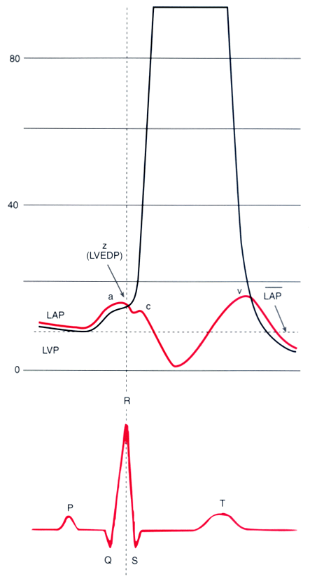 R wave. Mean LAP (9 mm Hg) underestimates LVEDP (15 mm Hg), but the LAP a wave pressure